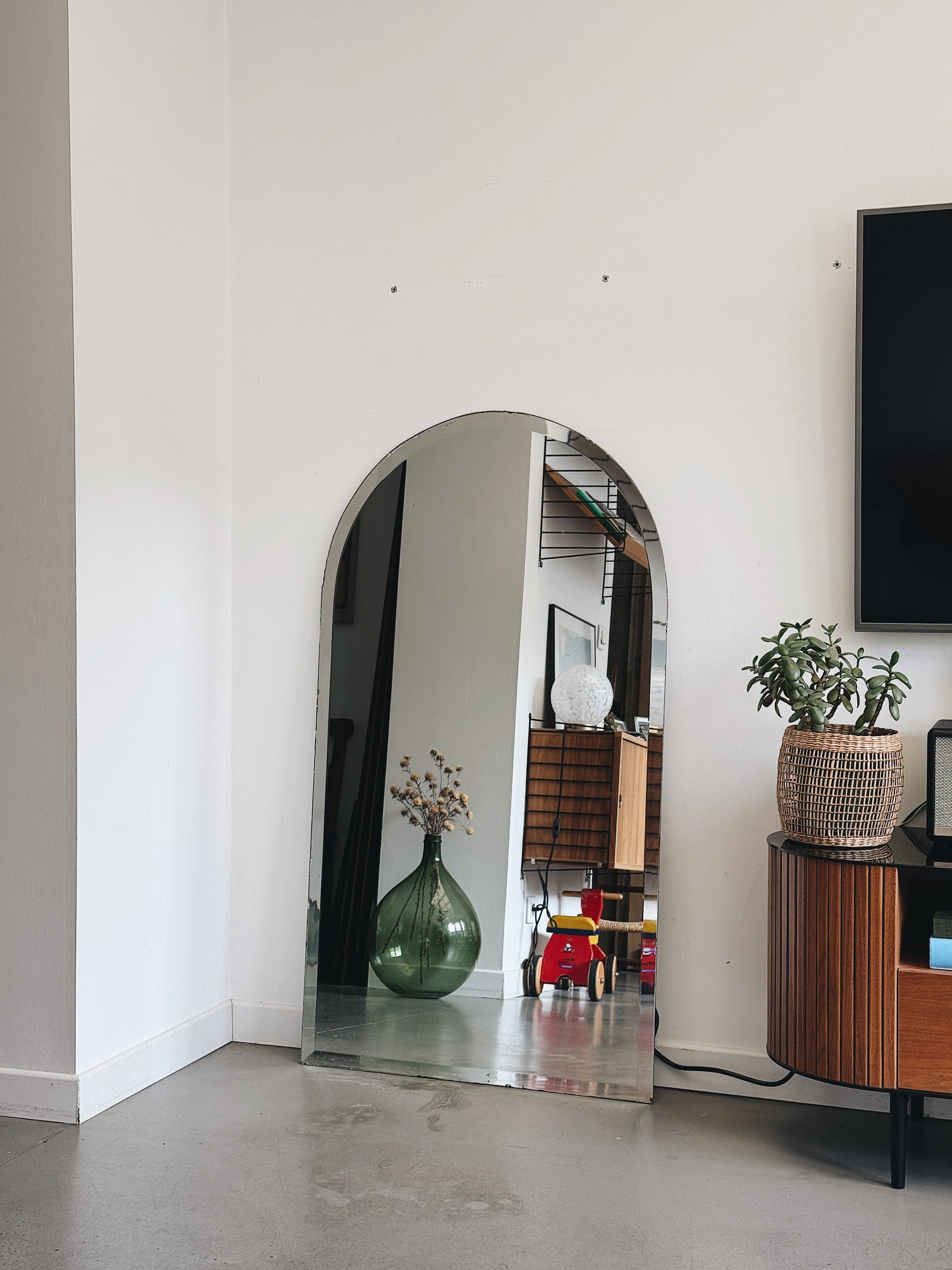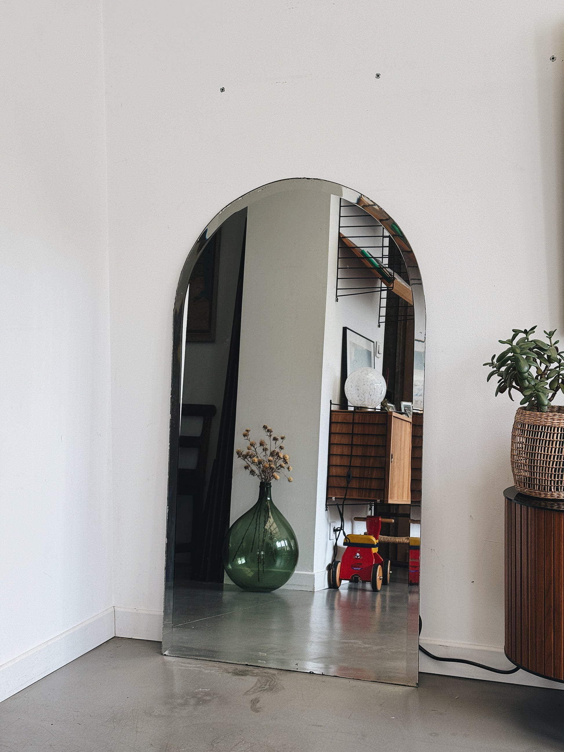 Une (sublime!) merveille de miroir ancien biseauté et piqué pour nous rappeler son âge et son histoire passée. Et que dire de sa forme arrondie en arche !! Vous l'aurez compris, sans surprise Marcelline est un (gros) coup de coeur, et j'espère qu'il en sera également un pour son ou sa futur.e propriétaire 🥰.